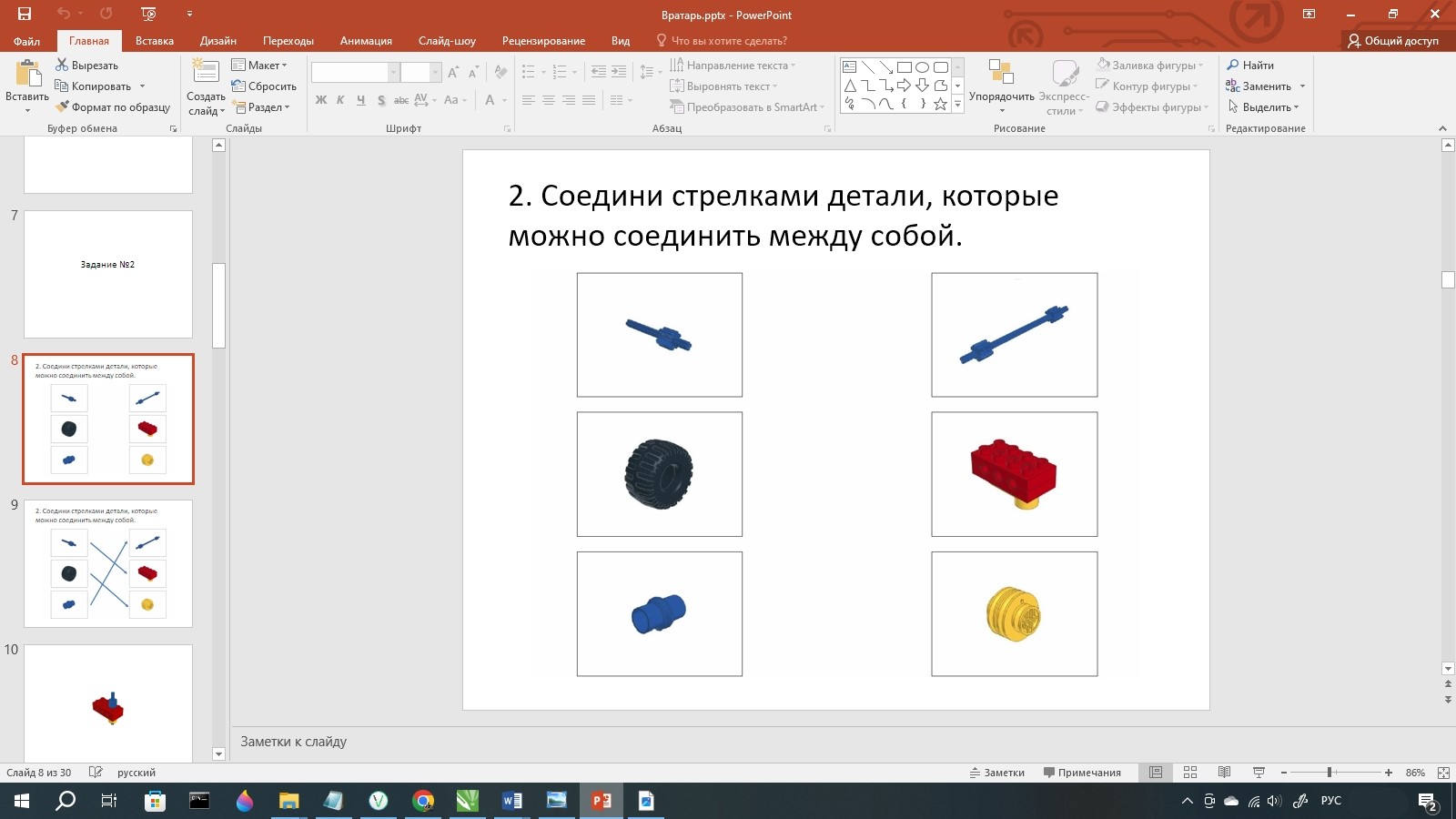 Закончив первое задание, педагог переходит к заданию №2. В нём необходимо соединить между собой стрелками детали, которые можно соединить(скрепить) между собой.