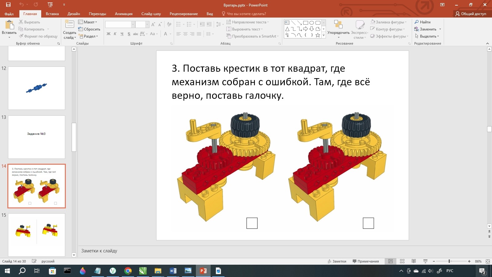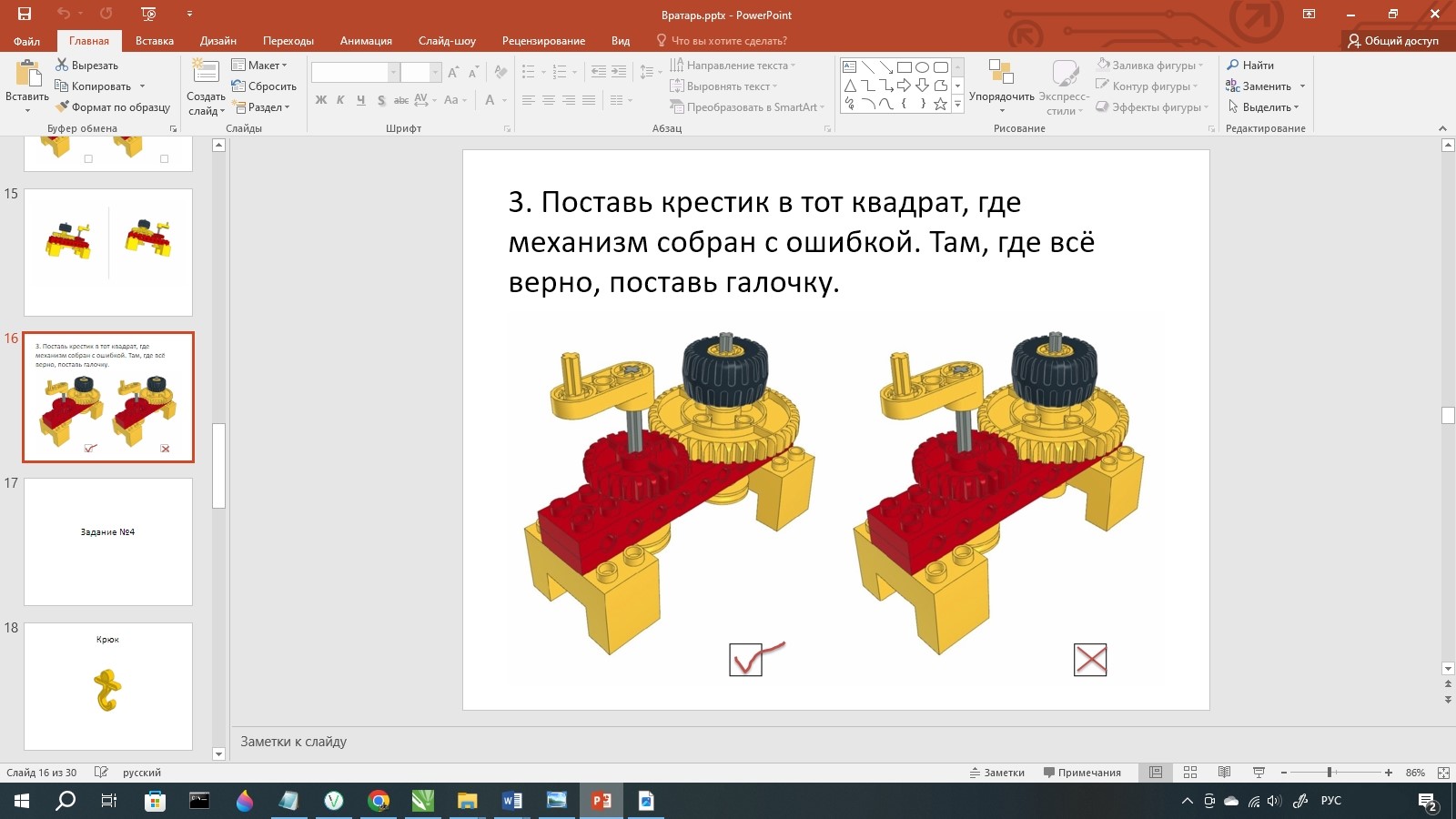 Затем идёт задание №3. В нём, ребятам необходимо поставить крестик в тот квадрат, где механизм собран с ошибкой. Там, где всё верно, поставить галочку.